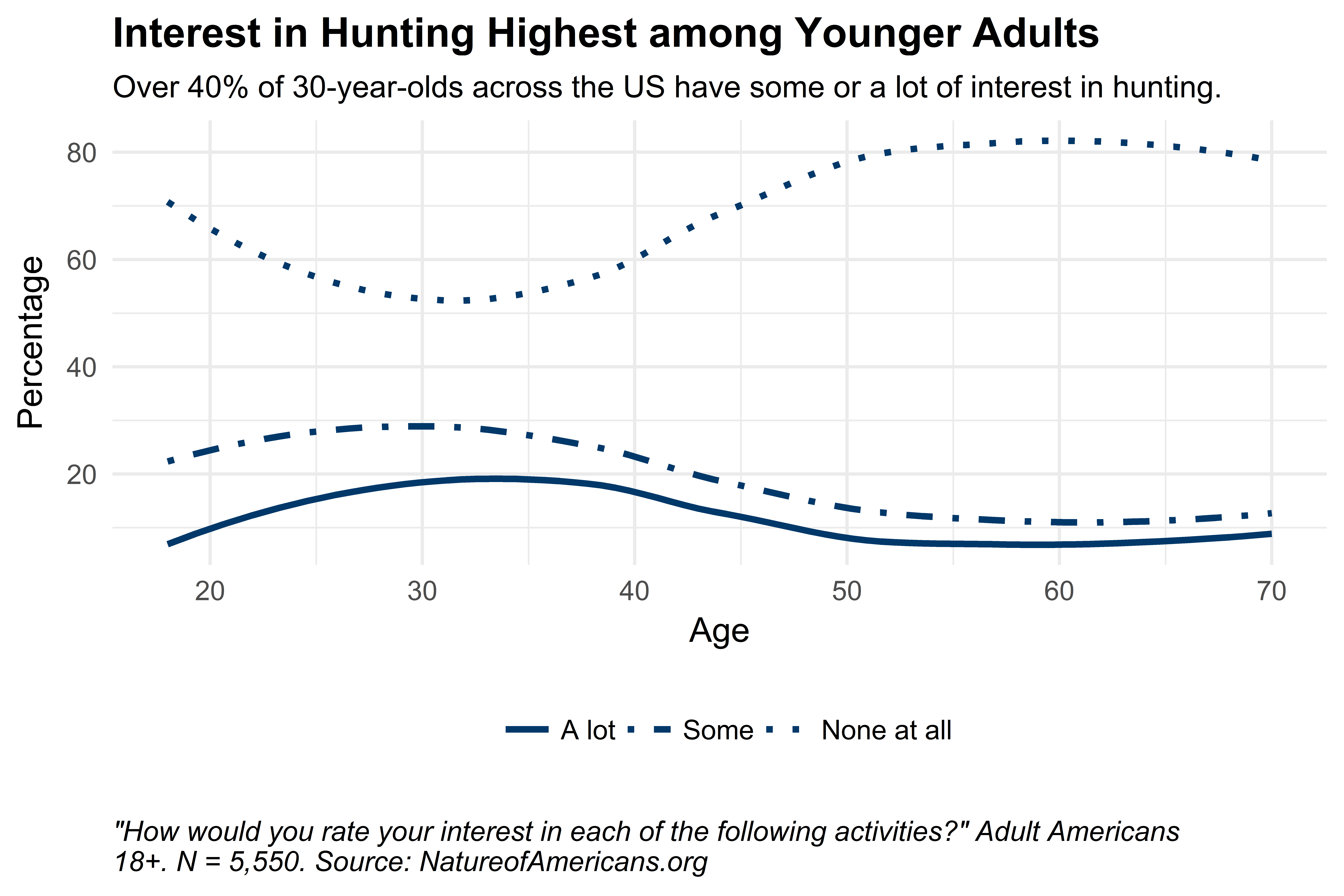 Interest in hunting is strongest among adults in their mid-20s through mid-30s. Over 40% of 30-year-olds have some or a lot of interest in hunting.